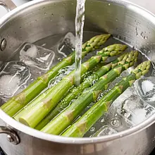 Wash the asparagus under running water. Snap or cut off the tough, woody ends (usually 2–3 cm from the bottom of the stalk) — break at the point where it naturally snaps. Prepare a pot with plenty of salted boiling water (about 1 teaspoon of salt per 1 liter). Add the asparagus to the boiling water and cook for 1.5–2 minutes (for thin stalks) until they become bright green and slightly soft, but still firm. Immediately transfer to a bowl of very cold water (ice) to stop the cooking process. After cooling, drain on a towel and cut into pieces 1–1.5 cm long.