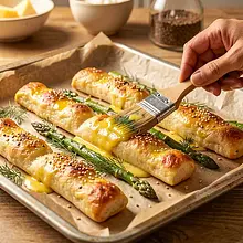 Delicate, crunchy cheese sticks with young asparagus and aromatic dill — a Kashubian variation on a classic snack, adapted for the spring season. The dough is buttery and cheesy, with small pieces of blanched asparagus and fresh dill, creating a pleasant contrast of textures: crispy on the outside, slightly moist on the inside. Perfect as a snack for children (handy, easy to hold), they are also great for parties, picnics, and a basket with regional additions. Serve with sour cream mixed with dill or as an accompaniment to sorrel soup — they have a pleasant, slightly salty taste and a golden crust.