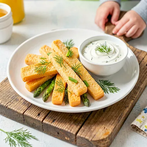 Arrange the sticks on a wooden board or plate in a single row. Place a bowl of dip next to them. Serve slightly warm or at room temperature. For a children's portion, you can add a few sticks with a slice of apple or carrot for color and fun in assembling the plate.