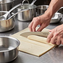 Prepare your workspace: sprinkle the countertop with flour (about 20 g) to prevent the dough from sticking. Roll out the sheet of puff pastry on the floured surface. If the sheet is very thick, briefly roll it with a rolling pin to a thickness of about 3–4 mm — do this gently and quickly to avoid warming the dough.