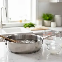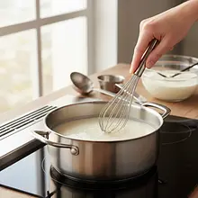 Najlepiej użyć rondelka z grubym dnem, który równomiernie rozprowadza ciepło i minimalizuje ryzyko przypalenia. Jeśli nie masz laski wanilii, możesz dodać 1 łyżeczkę (5 ml) ekstraktu waniliowego na samym końcu, już po zdjęciu z ognia.