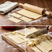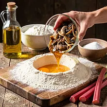 On a clean surface, make a mound of flour and create a large well in the center (like a crater). Pour the beaten eggs into the well, add 5 g of salt and 15 g of rapeseed oil. Begin mixing the center with a fork, gradually incorporating the flour from the sides into the mixture until a lumpy dough forms.