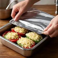 Cover the baking dish with aluminum foil (loosely, without pressing down on the cheese) and place it in the preheated oven. Bake for 30 minutes at 190°C. After 30 minutes, carefully remove the foil and continue baking for an additional 10–12 minutes, until the cheese on top is golden brown and the filling starts to bubble slightly. Check: insert a thin knife into one of the fillings — the knife should be hot when removed, and the filling should have a firm but creamy consistency (it should not be liquid).