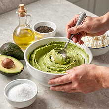 Creamy pasta made from ripe avocado and Polish twaróg — a quick, spring snack with a delicate, slightly tangy note thanks to lemon. This combination provides the pleasant creaminess of avocado and a distinct protein accent from the twaróg; it works great as a spread for rye bread or a dip for vegetables. The dish is simple to prepare (about 10 minutes) and visually striking: the green color of the paste is complemented by the red of the tomato and fresh chives. You can adjust the consistency — smooth with a blender or rustic with a fork — as well as the intensity of the seasoning. Perfect for snacks, a quick breakfast, or for entertaining as a platter with bread and vegetables.