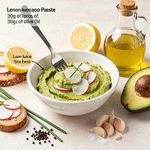 To the mashed avocado, add lemon juice (about 30 g), olive oil (15 g), garlic pressed through a garlic press or finely chopped (5 g), salt (1 g), and pepper (1 g). Mix everything for 20–30 seconds with a fork or spoon, refining the texture. Taste and add more salt or pepper if needed.