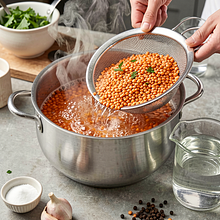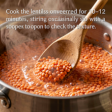 Weigh 200 g of dry red lentils and rinse them under cold water in a fine-mesh sieve, shaking until the water runs clear. Transfer the lentils to a medium pot (about 2–2.5 l). Pour in 600 ml of cold water so that the water is about 2 fingers above the level of the lentils. Add 2 g of black pepper (two pinches) and 2 g of salt (you can add half of the salt now, the rest at the end). Place the pot over medium heat and bring to a gentle simmer (small, even bubbles).