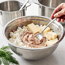Prepare the mackerel: place the smoked mackerel on a board, use a sharp knife to cut the skin along the back and gently detach the fillets from the bones. Hold the skin with one hand and separate the meat with a fork or knife to remove the skin and larger bones. Check for small bones with your fingers and remove them with tweezers or your fingers. Then, flake the meat with a fork — leave a few larger pieces for texture.
