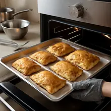Preheat the oven to 190°C (top-bottom, no convection). Bake the pastries for 18-25 minutes until golden and evenly browned. After baking, remove the tray and let the pastries cool on a rack for 5-10 minutes.