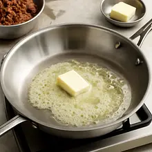 Heat a large skillet (preferably 24–28 cm) over medium heat. Add butter (30 g) and let it melt – it should foam but not burn. Toss in the chopped onion and sauté for 8–10 minutes, stirring with a wooden spoon every 1–2 minutes, until the onion becomes soft, translucent, and slightly golden. Finally, add the minced garlic and sauté for an additional 30 seconds, until fragrant (be careful not to burn it).