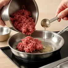 Increase the heat to medium-high, add 15 g of oil, then add the ground meat (500 g). Break up the lumps with a wooden spoon and fry for 8–10 minutes until the meat is no longer pink and starts to brown slightly. Stir every minute to ensure even cooking. After 10 minutes, check the pieces of meat — there should be no pink traces left.