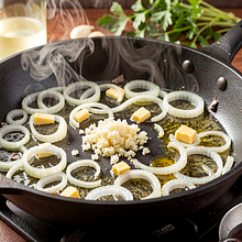 Heat a pan over medium heat, add 10 g of butter and 15 g of rapeseed oil. Peel the onion and chop it into small cubes. Sauté the onion for 6-8 minutes, stirring with a wooden spoon, until it becomes soft and translucent (do not brown it too much). Add the chopped garlic and sauté for 30-45 seconds, until it releases its aroma.