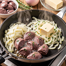 Move the onion to the side of the pan and add the remaining 10 g of butter. Slightly increase the heat and add the liver. Fry the liver for 3-4 minutes on each side, until the center is no longer raw, but do not overcook it — it can be slightly pink in the middle. After frying, combine the liver with the onion in the pan and remove from heat.