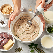 In a bowl, soak 100 g of breadcrumbs in 100 ml of milk and set aside for 5 minutes until it absorbs the liquid and softens. In a large bowl, place the chopped chicken breast, sautéed liver with onion and garlic, and the soaked breadcrumbs. Add 120 g of eggs (2 eggs), 60 g of butter (if any remains), chopped parsley, and spices: 8 g of salt, 2 g of black pepper, 4 g of marjoram, and 2 g of thyme. If the mixture seems dry, optionally add 100 g of 18% sour cream. Grind or blend in batches until you achieve a uniform, thick paste — the consistency should be creamy but not watery.