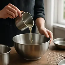 Pour the chilled cream into a cold bowl and start whipping with a mixer on medium speed. When the cream thickens, gradually add the powdered sugar and vanilla extract (if you want more flavor). Whip until stable but soft peaks form — about 3-4 minutes.