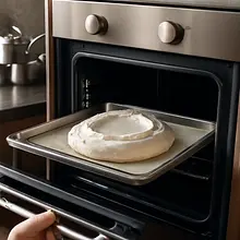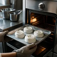 Place the baking tray in an oven preheated to 120°C (top-bottom, without convection). Bake for 90-100 minutes at this temperature: the meringue should become crispy on the outside and slightly browned. Do not open the oven in the first 60 minutes.