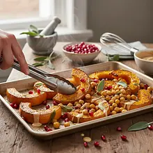 Spread the seasoned pumpkin and chickpeas on the prepared baking sheet in a single layer. Make sure the ingredients do not overlap too much - if they are too crowded, they will not roast crispy. Place the baking sheet in the preheated oven and bake for 20 minutes.