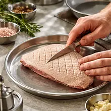 Carefully score the skin of the duck with a thin knife in a crosshatch pattern (do not cut into the meat) — diagonal cuts every 1–1.5 cm on the breast and thighs. Evenly sprinkle salt and pepper on the outside and inside of the duck (about 8 g of salt in total, 2 g of pepper).