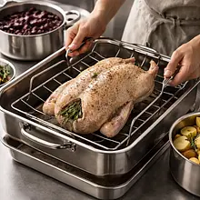 Place the duck on the rack in the roasting pan breast side up, and place a dish to catch the fat underneath the rack. Pour 150 ml of broth into the roasting pan (not inside the duck). Roast at 180°C for 60 minutes, basting the duck with a bit of fat from the roasting pan every 20 minutes — this will help achieve an evenly golden skin.