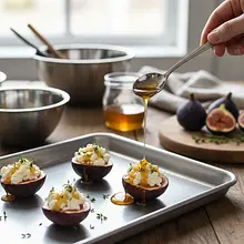Now it's time to stuff the figs. Take the goat cheese roll and using a small spoon or butter knife, place a portion of cheese (about 25g per fig) in the center of each slit fig. Gently open the 'petals' of the fig to make room for the cheese. Arrange the stuffed figs on a baking sheet lined with parchment paper. Drizzle each fig with a little honey (about half of the total amount), then sprinkle with fresh thyme leaves (pluck them from the stems), a pinch of sea salt, and freshly ground black pepper.