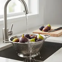Dokładnie umyj figi pod bieżącą, zimną wodą, a następnie delikatnie osusz je ręcznikiem papierowym. Odetnij twardą końcówkę ogonka. Używając małego, ostrego noża, natnij każdą figę od góry na krzyż, mniej więcej do 3/4 jej głębokości. Uważaj, aby nie przekroić figi do końca – powinna się otwierać jak mały kwiatek.