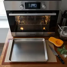 First, preheat the oven to 200°C, setting it to the convection function. Prepare a large, flat baking tray. Now, let's take care of the vegetables. First, wash the butternut squash thoroughly, then peel it using a sturdy vegetable peeler or a sharp knife. Cut it in half lengthwise and, using a large spoon, vigorously scoop out the seeds and the fibrous flesh surrounding them. Cut the cleaned squash into even cubes about 1.5-2 cm on each side. Peel the red onion from its outer layers and cut it into thick wedges. Peel the garlic cloves and finely chop them. Cut the bacon into strips about 1 cm wide. Finally, separate the sage leaves from the tough stems.