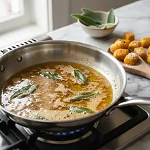 In a large skillet (preferably with a light bottom to control the color), melt the butter over medium heat. Once melted and starting to foam, add whole sage leaves and lightly crushed garlic cloves. Heat, stirring occasionally, for about 4-6 minutes. The butter will begin to change to an amber color and release an intense, nutty aroma. Brown bits will appear at the bottom – these are caramelized milk proteins that add flavor. Be careful not to burn the butter! Once it reaches the desired color, immediately remove from heat. The sage leaves should become crispy.