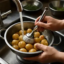 Place the chopped potatoes in a large pot and cover them with cold water. Add 5 g of salt (1 teaspoon). Bring to a boil over high heat, then simmer for 8-10 minutes — the goal is to achieve a slight softness at the edges, but not to cook them completely. Check with a fork: the top should be gently soft, but the center still firm.