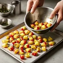 Preheat the oven to 220°C (200°C with fan). Place the rack in the middle position of the oven. Take a baking tray measuring about 30x40 cm and line it with parchment paper or lightly grease it with a thin layer of oil to prevent sticking.