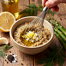 Delicate baked salmon with a hint of lemon is an elegant dish perfect for a May Day lunch or an outdoor picnic. The salmon fillet marinated in canola oil, garlic, and lemon juice is baked briefly to remain juicy and easily flake with a fork. It is accompanied by fluffy cooked pearl barley with butter and dill, and young asparagus either roasted or briefly sautéed with a splash of lemon juice. The dish combines the creamy texture of the barley, the crunchiness of the asparagus, and the silkiness of the fish — it looks great on a light plate, garnished with lemon slices and fresh dill. Recommended with a light white wine or chilled cider; easy to prepare outdoors (on the grill) or in a home oven.