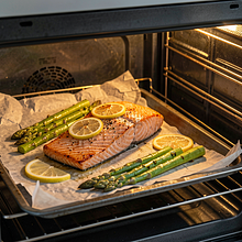 Preheat the oven to 200°C (top-bottom) or 180°C with fan. On a baking sheet lined with parchment paper, place the salmon skin-side down and next to it, the tray with asparagus (if they don't fit together, bake the salmon first). Bake for 12-18 minutes depending on the thickness of the fillet — thicker pieces will need closer to 18 minutes. The asparagus will be ready after 8-12 minutes, they should be tender-crisp with slightly browned tips.