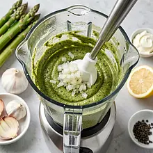 To the blender with the cooked asparagus, add the previously sautéed finely chopped onion (sweated in 1 teaspoon of oil), 2 cloves of garlic pressed through a garlic press, 100 g of cream, and 1/2 of the lemon juice. Blend until smooth purée. If the mixture is too thick, add 1-2 tablespoons of the asparagus cooking water until you achieve a velvety consistency. Taste and season with salt and pepper.