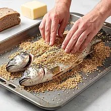 Preheat the oven to 200°C (top-bottom) with the fan function at 180°C, if available. Prepare a baking tray lined with parchment paper. Drizzle the fish with a small amount of rapeseed oil on the outside and gently coat them in the prepared spelt crumbs — use a spoon to press the crumbs onto the skin to ensure they stick well.