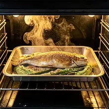 Place the fish on the middle rack of the oven and bake for 18-22 minutes depending on the size of the trout (about 18 minutes for a 250 g piece). The fish is ready when the meat near the backbone easily flakes and has an opaque, matte texture. The crust with crumbs should be golden and crispy.