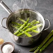 In a pot, bring 500 ml of salted water to a boil. Add the chopped asparagus and cook for 5-6 minutes until they are bright green and tender when pierced with a fork. Remove them with a slotted spoon to a blender. Place the reserved asparagus tips into the boiling water for 1 minute, then transfer them to a bowl of ice-cold water (blanching) — this will preserve their color and texture for decoration.