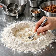 Slowly pour the liquid into the well in the flour and mix with a fork or the handle of a spoon, only the center part, first bringing the flour from the sides to the center. Once the ingredients are combined, start kneading with your hands: gather the flour from the sides and knead until a uniform, smooth dough forms. Knead for 6–8 minutes until the dough stops sticking and becomes elastic. If it is too dry, add 1 tablespoon of water (15 ml); if it is too sticky, sprinkle with a tablespoon of flour.