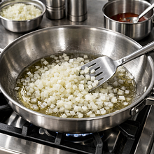 Heat 15 g of rapeseed oil in a large skillet over medium heat. Add the chopped onion and sauté for 4–5 minutes until it becomes translucent and slightly golden. Add 400 g of ground meat and 150 g of chopped sausage, breaking up the meat with a wooden spoon. Cook for 8–10 minutes until the meat is well browned. Add 15 g of garlic and sauté for an additional 1 minute — the garlic should be fragrant but not burnt.