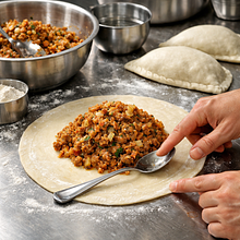 Place about 18–22 g of filling on each circle (use a teaspoon). Wet the edges of the circle with your finger, fold it in half, and seal the edges tightly by pressing with your fingers and removing the air. You can also crimp the edges with a fork or create a ruffled edge with one finger by folding small pleats.