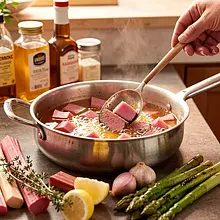 In a medium saucepan, melt the butter over medium heat. Add the chopped shallot and sauté for 3-4 minutes until it becomes translucent and soft. Add the garlic and sauté for 30 seconds until fragrant. Add the chopped rhubarb, 2/3 of the honey, and red wine vinegar. Slightly increase the heat and cook, stirring occasionally, for 8-10 minutes until the rhubarb breaks down and the mixture thickens. If it is too thick, add 2 tablespoons of chicken broth at a time to achieve a glossy consistency. Finally, season with salt and pepper, add the juice of half a lemon, and a bit of fresh thyme. If you want a smooth glaze, briefly blend with an immersion blender to the desired smoothness.