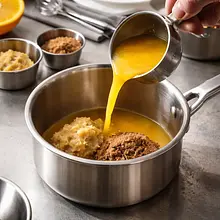 In a small saucepan, combine 200 g of fresh orange juice, 60 g of light miso, 30 g of brown sugar, 30 g of soy sauce, 20 g of rice vinegar, and 40 g of honey. Heat over medium-low heat and whisk until the sugar and miso dissolve. Gently simmer (small, steady bubbles) for 8-12 minutes, until the sauce reduces by about 25-30% and thickens to a glossy, thick glaze consistency. Finally, remove from heat and vigorously whisk in 20 g of cold butter — this will add shine and smooth out the flavor. The sauce should nicely coat the back of a spoon.