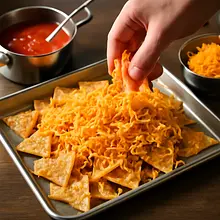 Preheat the oven to 200°C (top-bottom) or set it to grill mode/oven with top heating function. Line a large baking tray with parchment paper. Evenly spread tortilla chips on the tray in a single layer, creating a light 'nest' (larger chips at the bottom, smaller ones in the gaps).