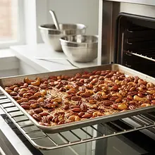 Zacznij od przygotowania piekarnika i blachy. Ustaw piekarnik na temperaturę 160°C z funkcją termoobiegu (lub 170°C góra-dół). Dużą blachę do pieczenia wyłóż arkuszem papieru do pieczenia. Dzięki papierowi orzechy nie przywrą do blachy, a sprzątanie będzie o wiele łatwiejsze.