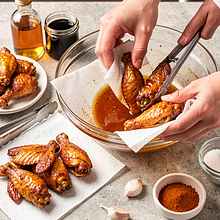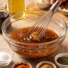 Prepare the marinade: pour honey into a large bowl (if it's thick — warm the jar in hot water for 1-2 minutes), add canola oil, soy sauce, and apple cider vinegar. Peel the garlic and press it directly into the bowl. Add hot and sweet paprika, salt, and pepper. Mix vigorously with a spoon or whisk for 30-45 seconds until the ingredients combine into a uniform, sticky emulsion.
