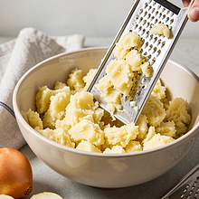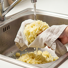 Peel the potatoes and one of the onions. Use a coarse grater and grate the potatoes directly into a large bowl (hand grater) or use a food processor with a grating disc. If the potatoes start to darken, work faster or briefly place them in a bowl of cold water — but they need to be dried well afterwards.