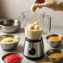 Prepare all the ingredients and tools: hand or standing blender, measuring cup, large bowl, spoon, sieve (optional). Weigh and prepare the ingredients according to the list. Peel the bananas and set them aside on the cutting board.