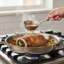 Once the roulade is seared, remove the dish from the stove. Pour hot broth or water into the bottom. Optionally, you can add a sprig of fresh rosemary. Place the dish uncovered in the preheated oven. Bake for about 80-90 minutes. Every 20 minutes, baste the roulade with the sauce that forms at the bottom of the dish. To check if the meat is done, insert a kitchen thermometer into the thickest part – it should read 70-72°C. If you don't have one, clear juice, not pink, should flow out when pierced.