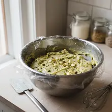 In a medium-sized bowl, combine the dry ingredients. Add the prepared pistachio flour, all-purpose flour, baking powder, ground cardamom, and salt. Mix everything thoroughly with a whisk. This will ensure that the leavening agents and spices are evenly distributed in the mixture, and each cookie will taste the same.