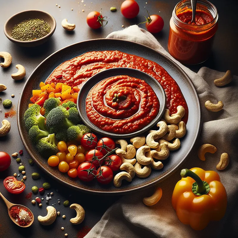 Aromatic, thick, and creamy tomato sauce in a vegan version, combining roasted tomatoes, sautéed vegetables, and the velvety creaminess of cashews. The inspiration was the concept of a "progressive" sauce — layering flavors (roasted treasures, umami from miso, smoke from smoked paprika) and attention to texture (cashew cream instead of cream). The sauce has a deep, slightly smoky aroma, pleasant acidity, and a smooth texture; it pairs wonderfully with pasta, polenta, baked vegetables, and serves as a base for vegan "meatballs." Served, it looks impressive — the intense red of the tomatoes, green basil leaves, and light notes of cashew cream create a visual and flavor contrast.