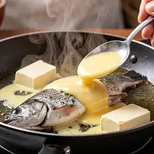 Reduce the heat to medium and add 20 g of butter to the pan — allow the butter to foam and brown slightly (golden note), basting the fish with the pan butter 2–3 times using a wooden spoon. Cook for another 3–4 minutes on the other side, until the flesh is opaque and easily flakes away from the bones with a gentle press of a fork. The total cooking time for fish that is 2.5 cm thick is about 8–10 minutes.