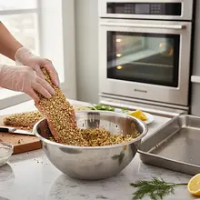 Preheat the oven to 190°C (fan) or 200°C (top-bottom). Take each trout fillet one by one and bread it. First, coat it thoroughly in flour on both sides, shaking off the excess. Then, dip it in beaten egg, making sure the entire surface is covered. Finally, transfer the fillet to a plate with the mixture of nuts and breadcrumbs. Press the coating firmly onto the fish on both sides to ensure it sticks well.