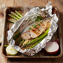 Delicate trout baked in foil with spring vegetables (asparagus, young carrots, onion) and lemon — a simple classic of Polish cuisine with a regional touch of pearl barley as a hearty side. The dish combines the mild flavor of the fish with the slightly sweet, crunchy vegetables of the spring season; the foil seals in the aromas and keeps the meat juicy. Serve hot, straight from the foil or plated, garnished with fresh dill and a slice of lemon. Great for a family dinner or a light Sunday lunch — impressive yet easy to make even for a beginner cook.